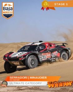Mathieu Serradori, al volante de un CR7 Century, gan la primera jornada de la Baja Marruecos. Simon Vitse fue el ms rpido en la ES1 de 86 kilmetros con un Optimus EVO 5, mientras que Serradori termin esta etapa a +1:03 de l. Mathieu gan la ES2 de 50 km y la ES3 de 102 km, lo que le permiti tomar la delantera de la general tras las tres primeras especiales. Nicolas Delencre se clasific segundo en la categora Ultimate con una ventaja de +31:24. La tripulacin femenina de Maria Gameiro y Rosa Romero en un MINI JCW RALLY 3.0d termin tercera con una ventaja de +35:33.