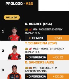 Ricky Brabec ha ganado! El estadounidense marc el mejor tiempo del prlogo de los motociclistas, con un tiempo de 12 minutos, 48 segundos y 3 dcimas. Se impuso por delante de su compaero de equipo Tosha Schareina, superado por 1,5 segundos, y del campen del mundo Daniel Sanders, quien termin a 5 segundos. Luciano Benavides queda a 10 segundos, lo que da una clasificacin compuesta por dos Honda por delante de dos KTM. Esta es la primera victoria de Brabec en el Rallye du Maroc desde la cuarta etapa de la edicin de 2022.