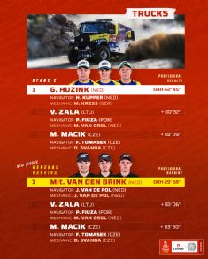 Ales Loprais, Martn Macik, Vaidotas Zala y Huzink fueron los grandes animadores del da en los caminos saudes. El neerlands tom la punta en el kilmetro 360 y contuvo los intentos de Zala hasta el cierre para ganar en 4h42:35 y reencontrarse con el xito despus de sus triunfos parciales en las etapas 9 y 10 de la edicin 2024. El lituano termin a 32 segundos del vencedor y el checo concluy a 1:09, mientras que Mitchel Van den Brink y Loprais arribaron cuarto y quinto, respectivamente.