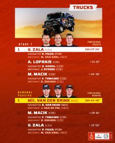 La Etapa 7 del Rally Dakar lleg a su fin, y en esta ocasin la categora Camiones tuvo a Vaidotas Zala como el referente. El lituano realiz un tiempo de 04:27:24, mientras que la segunda posicin qued para Ales Loprais (+1:23) y tercero Martin Macik (+4:58). El mismo recorri desde Riyadh hasta Wadi Ad Dawasir, con 459 kilmetros de especial.