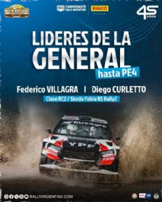 Con la disputa de los primeros kilmetros cronometrados ayer en el PE 1 en Mina Clavero, Super especial Cheche Carlomagno, ms los tres tramos que completan la primera etapa de hoy,(PE 2:Tala Caada-Rio Jaime; PE3: El cruce-Ambul y PE 4: El Mirador-Cuesta San Luis en su primer rulo), el binomio de Federico Villagra y Diego Curletto (Skoda) se ubican como lderes de la clase RC2 y de la clasificacin general, registrando un tiempo de 33.o8,0 precediendo al binomio puntano de Miguel Baldoni y Gustavo Franchello (Skoda) por +0.11,1 s, y en tercer posicion a Gastn Pasten y Matas Ramos (Skoda) a +0.18,9 s. todos dentro de la clase RC2. Mientras que en cuarto lugar lo hace Luis Arceluz con Ezequiel Queralt (Citroen).
