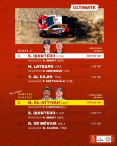 En la clasificacin general, es Al-Attiyah quien lidera el clasificador tras dos actuaciones slidas, aunque no espectaculares. El piloto de Qatar cuenta con una exigua ventaja de siete segundos sobre el ganador del lunes, Quintero, quien se recuper en gran medida de una dura etapa inicial el domingo, en la que termin 18 tras una penalizacin de dos minutos por exceso de velocidad.