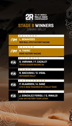 Saood Variawa y Henk Lategan le brindan a Sudfrica su cuarto doblete en la historia del Dakar, todos ellos conquistados en tierras saudes. El primero se remonta a la quinta etapa de la edicin 2021, ganada por Giniel de Villiers por delante de Brian Baragwanath. Un ao ms tarde, De Villiers se impuso por delante de Lategan... aqu mismo, en Wadi ad-Dawasir, durante la novena etapa! Por ltimo, Lategan gan la quinta etapa de 2025 tras imponerse a Guy Botterill.